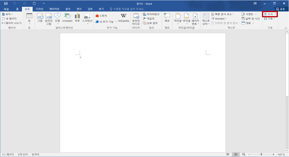 먼저 아래의 그림과 같이 [삽입] 탭에서 [수식]을 눌러주세요.