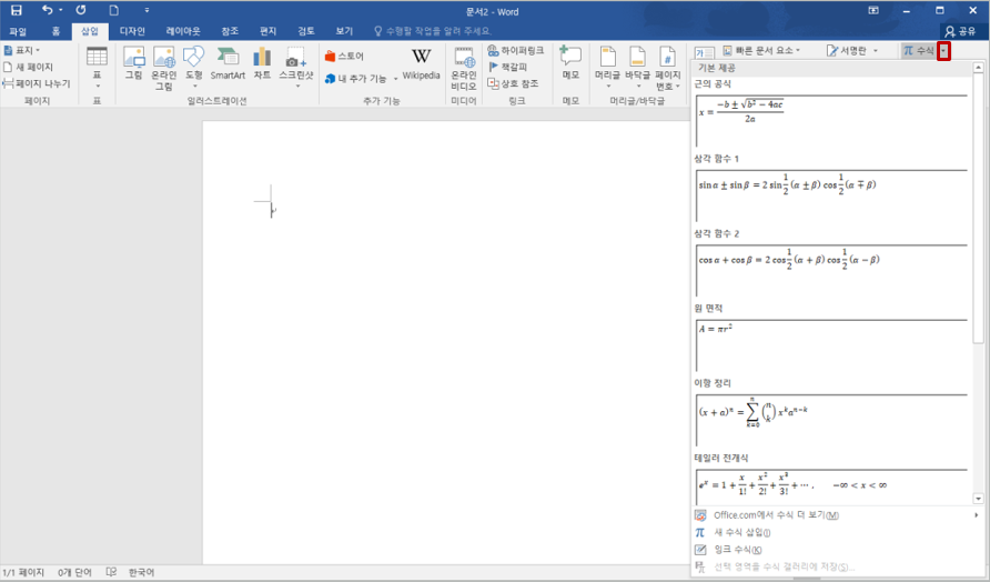 를 클릭하면 아래와 같은 Office에서 기본으로 제공하는 수식들이 뜨는데, 이 것이 바로 첫 번째 Tip입니다.