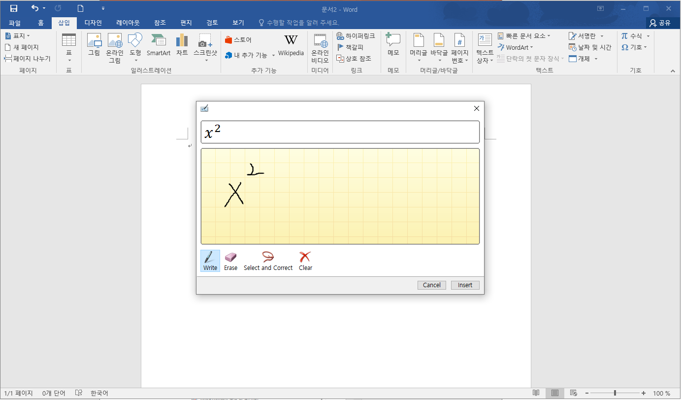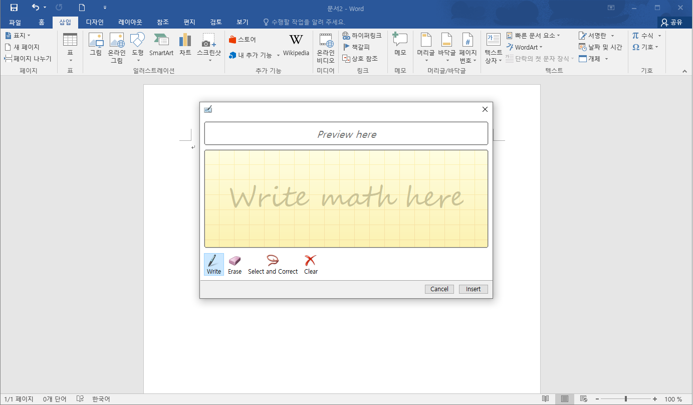 두 번째 Tip은 잉크 수식입니다. 아래 그림과 같이 [잉크 수식(K)]를 클릭합니다.