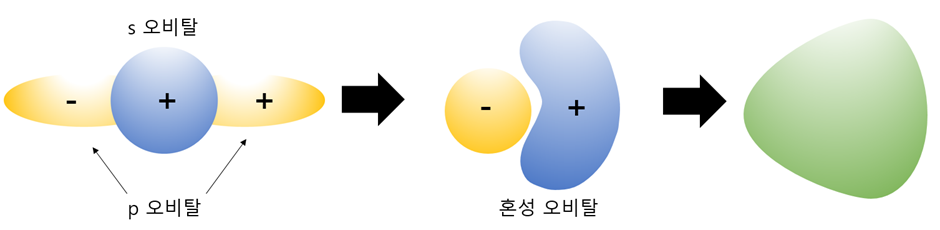 이전 글인 오비탈이란? (Orbital)에서 밑에 그림과 같이 설명을 드렸습니다. 하지만 항상 이러한 모양으로 존재하지는 않습니다. 왜냐하면 s와 p를 생각해보았을 때 서로 겹치는 부분이 있어 서로 간섭을 하여 오비탈의 모양이 바뀌기 때문입니다. 아래 그림처럼 구처럼 생긴 s오비탈과 아령 모양의 p오비탈이 서로 간섭하여 기형적인 오비탈의 모습을 가지게 됩니다. 이때 에너지 준위는 p오비탈과 s오비탈의 중간 정도의 에너지 준위를 가지게 됩니다.