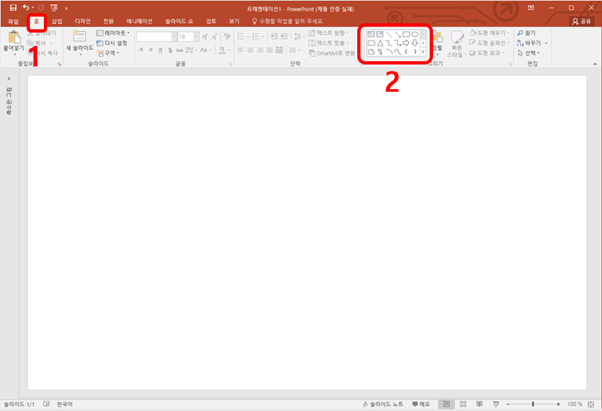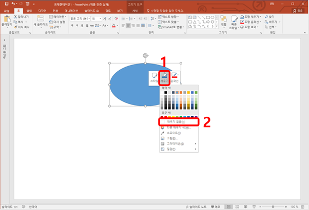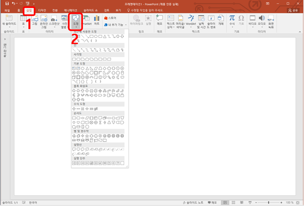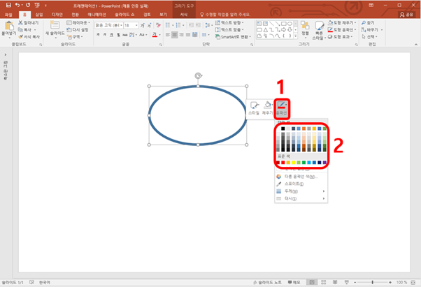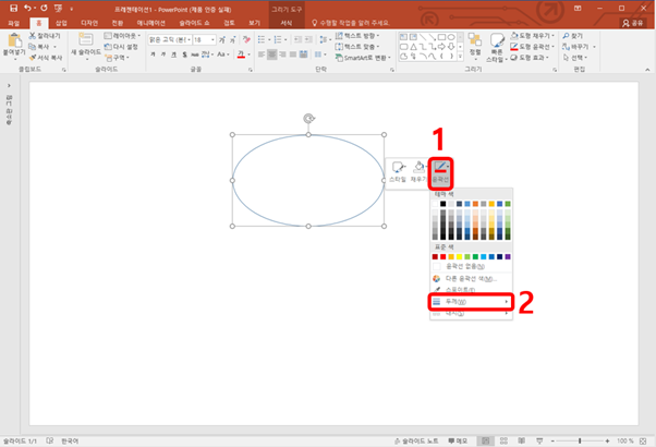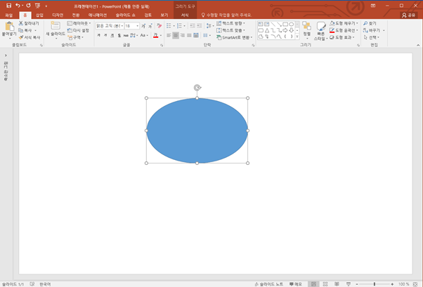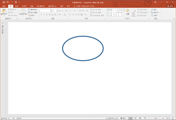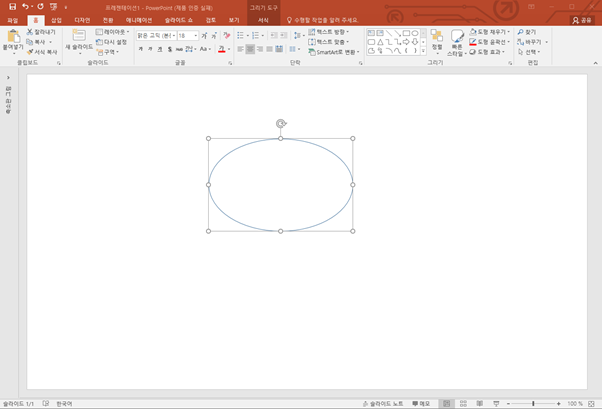 먼저 파워포인트 홈 메뉴의 오른쪽에 그림창, 또는 삽입 메뉴의 도형을 위 그림과 같은 동그라미를 하려면 오른쪽 위에 동그라미를 클릭해서 아래와 같은 원을 만들어주시면 됩니다