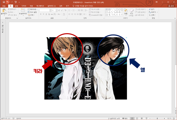 조금만 응용해보면 도구 항목에 있는 화살표 표시와 텍스트 표시를 사용하여 대조적인 캐릭터들을 강조하며 설명할 수 있습니다. 간단하지만 긴 글 읽어주셔서 감사합니다.