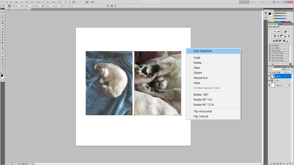 오른쪽 레이어바에서 원하는 이미지가 있는 레이어를 선택한 후 Ctrl + T를 이용하면 위 오른쪽 그림과 같이 적용되었다는 테두리가 보입니다. 이때 오른쪽 마우스를 누르면 관련 창이 뜨고, 이 곳에서 원하는 형태(자유변형, 크기변형, 왜곡, 반전, 180도 회전 등)로 변형이 가능합니다.
