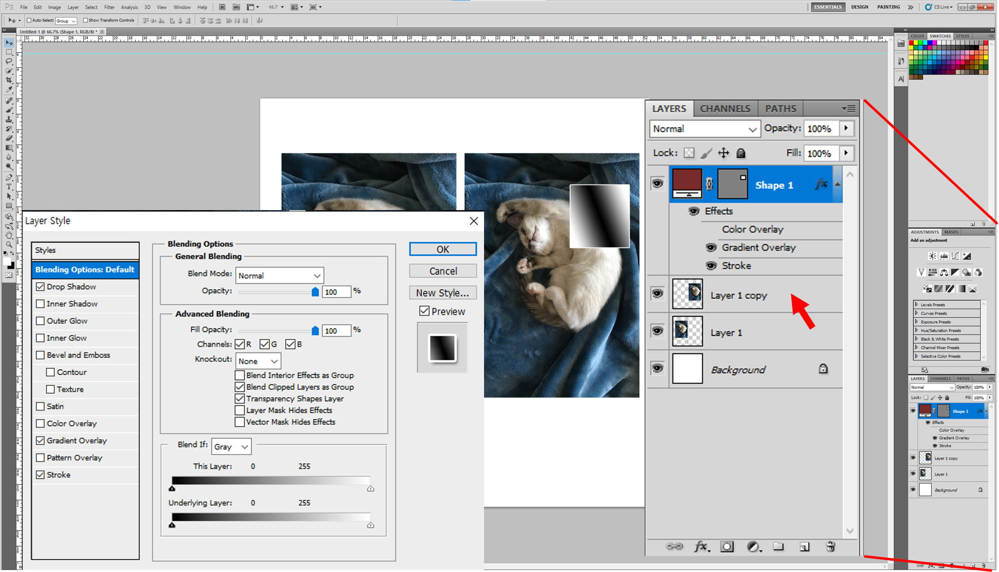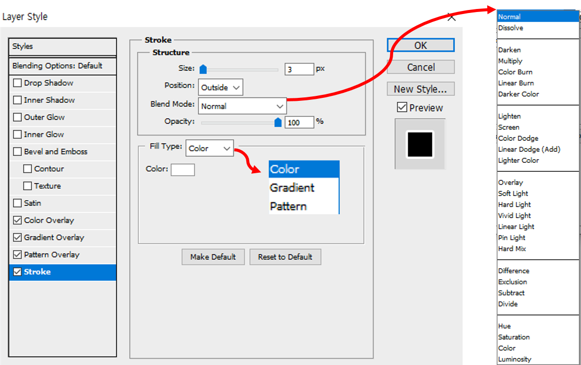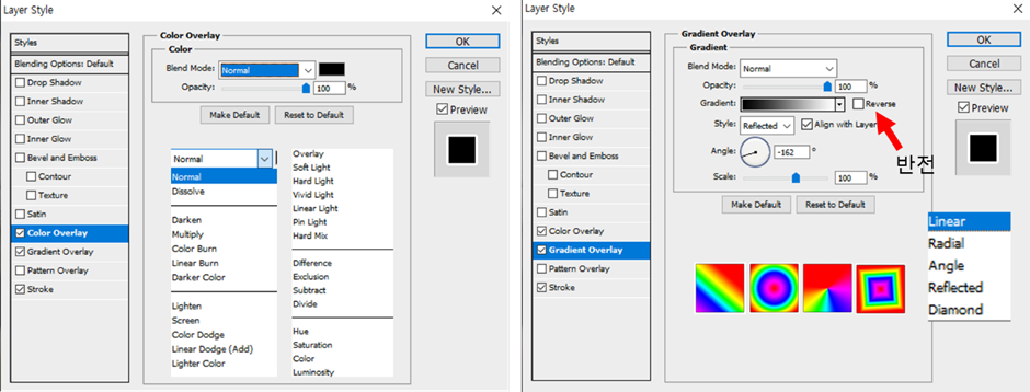 기본 색상 지정 < Color Overlay < Gradient Overlay
