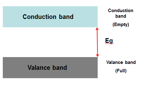 4개의 가전자 중 3s의 2개는 완전히 채워져 있고 2개의 양자상태를 가지며 3p의 2개는 원자당 6개의 양자상태를 가집니다. 두 개 이상의 실리콘 원자들이 서로 가까워지면 3s와 3p가 상호작용하고 중첩됩니다. 평형상태의 원자 간 거리에서 밴드는 분리되고 원자당 4개의 양자상태는 낮게, 4개의 양자상태는 높게 분포됩니다. 0K에서 전자들은 가장 안정한 상태를 가지고 이때 낮게 위치한 밴드는 가전자대(valance band, Ev), 높게 위치한 밴드는 전도대(conduction band, Ec)라 부릅니다. 가전자대와 전도대 사이의 에너지 간격을 밴드갭(bandgap, Eg)이라 부르고 이는 금지밴드의 폭에 해당합니다.