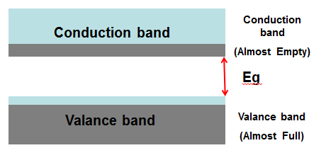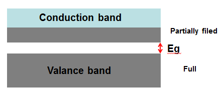 다른 하나는 가전자대가 충만하고 전도대가 부분적으로 채워진 형태입니다. 이 형태는 밴드갭이 아주 작고 전도대가 부분적으로 채워져 있어 전도에 이용될 수 있는 충분한 전자들이 있습니다.