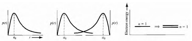 원자 중 가장 간단한 수소원자를 예시로 하겠습니다. 밑의 그림과 같이 원자의 최저 전자 에너지의 반경 확률 밀도 함수를 한번 보겠습니다. 두 개의 원자들이 서로 먼 거리에 있다가 가까워지게 되면 두 확률 밀도 함수가 중첩이 됩니다. 이렇게 두 원자들은 서로 상호작용하여 불연속적으로 양자화된 에너지 준위가 파울리의 배타 원리로 인해 두 개의 불연속 에너지 준위로 분리됩니다.