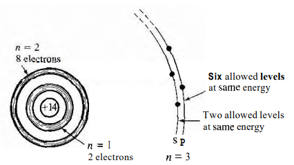 이제 반도체의 기본 재료인 Si(실리콘)의 경우를 살펴봅시다. 실리콘은 전자를 14개를 가지고 있습니다. 10개는 원자핵에 가깝게 있어 깊은 에너지 준위를 가지고 있고 4개는 n=3에 위치해 비교적 구속력이 약합니다.