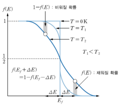 임의의 온도에서는 그림에서 보신 바와 같이 전자의 분포가 바뀌게 되고, 에너지 준위에서도 변화가 생기게 됩니다. 그리고 E=Ef 일 때, 항상 50%가 되므로 이를 기준으로 전자의 상태를 확인할 수 있습니다.