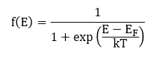 페르미-디랙 확률함수는 임의의 온도 T에서 에너지 준위 E가 입자에 의해 채워질 확률을 뜻합니다. 단위 에너지당 단위 부피당 입자의 수를 N(E), 단위 에너지당 단위 부피당 양자상태의 수를 g(E)라 하고, N(E)/g(E)를 페르미-디락 확률함수(f(E))라 합니다. f(E)는 다음과 같이 나타납니다.
