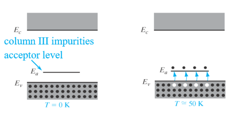 P-type 반도체는 3족 원소가 불순물로 첨가되어 정공이 다수 캐리어가 되는 반도체입니다. 억셉터가 첨가되면 가전자대 주위에 억셉터 에너지 준위가 형성됩니다. 반도체에 에너지를 가하게 되면 가전자대에 있는 전자가 바로 위에 형성된 억셉터 에너지 준위로 이동하여 가전자대에 정공이 형성됩니다.