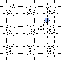 도펀트의 종류에는 주로 3족과 5족 원소들이 있습니다. 3족 원소에는 B(붕소), Al(알루미늄), Ga(갈륨), In(인듐) 등이 있습니다. 실리콘에 3족 원소들을 첨가하게 되면 3족 원소는 3개의 가전자가 있어 모두 공유결합을 하게 되고 하나의 공유결합 자리가 남게 됩니다. 빈자리에 전자를 채워야 하므로 실리콘 원자의 전자가 이동하여 빈자리가 생기게 됩니다. 이렇게 전자를 받아들이는 3족 원소들을 억셉터(acceptor)라고 합니다.