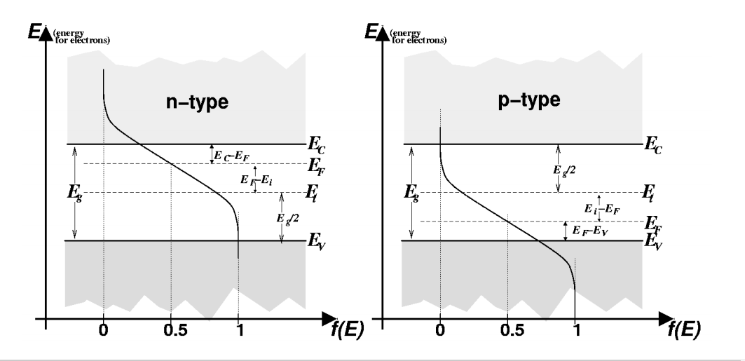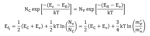 진성 반도체의 페르미 준위는 밴드갭의 중앙에 근접해 있습니다.. 진성 반도체는 전자 밀도와 정공 밀도가 같으므로(ni=pi) 다음과 같이 놓을 수 있습니다.