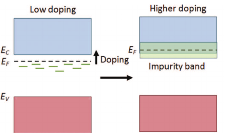 하지만, 불순물의 양이 증가하면 상황이 달라집니다. 불순물의 양이 많아지면 어느 순간에는 불순물끼리 상호작용을 하게 될 것입니다. 원자들이 상호작용을 하게 되면 그들의 에너지 밴드가 형성이 되고 그 양이 증가하면 할수록 에너지 밴드의 두께는 두꺼워지게 됩니다. 결국 불순물의 에너지 밴드가 전도대나 가전자대와 겹치게 되면 페르미 준위는 전도대나 가전자대 내부에 존재하게 됩니다. 이러한 형태의 반도체를 축퇴 반도체(degenerate)라 합니다.