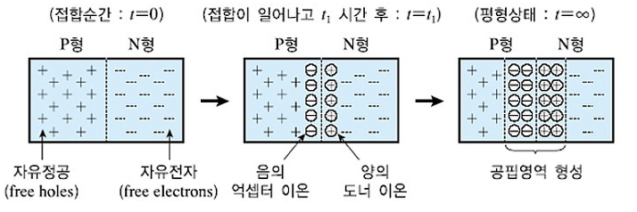 p-type과 n-type을 접합하면 반도체는 금속학적 접합(metallurgical junction)에 의해 두 영역으로 나뉘어 지게 됩니다. 그리고 n영역의 전자는 p영역으로 확산하고, p영역의 정공은 n영역으로 확산하게 됩니다. n영역에는 양으로 대전된 도너 원자가 남고, p영역에는 음으로 대전된 억셉터 원자가 남게 됩니다. n과 p영역의 순수 전하들은 금속학적 접합 근처에서 양의 방향에서 음의 방향으로 전계를 발생시킵니다.