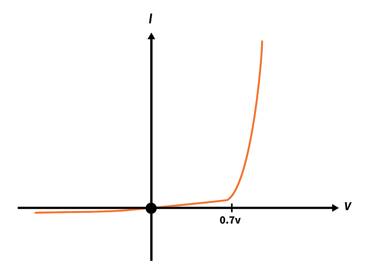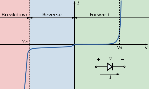 이상적인 I-V 커브에서 보다시피 순방향(p->n)에서 전류가 흐르는 것을 확인할 수 있습니다. 하지만, 실제 동작에서는 문턱전압(threshold voltage)이 존재하여 어느 정도의 전압을 필요로 합니다. Si로 제작된 다이오드는 0.7V, 쇼트키 다이오드는 0.5V, Ge로 제작된 다이오드는 0.3V의 전압이 필요합니다.