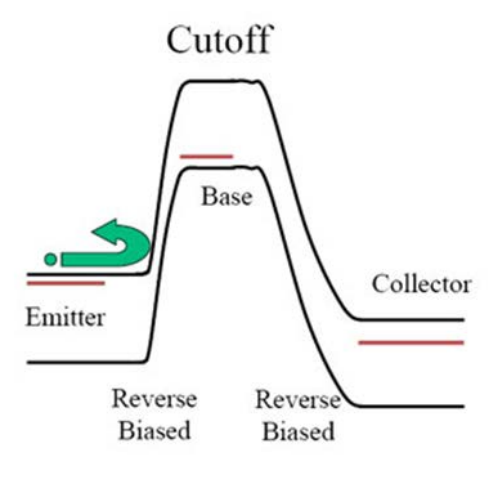 차단모드는 B-E접합과 B-C접합의 바이어스가 역방향 바이어스인 상태입니다. 양쪽에 역방향 바이어스가 걸려 베이스의 에너지 밴드의 형태가 크게 휘어 캐리어가 넘어가기 힘든 구조를 보입니다.