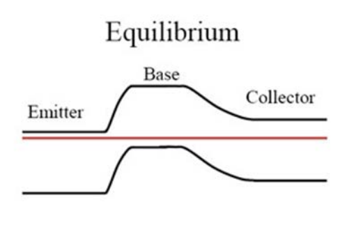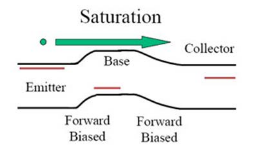 포화모드는 B-E접합과 B-C접합의 바이어스가 순방향 바이어스인 상태입니다. 양쪽에 순방향 바이어스가 걸려 에너지 밴드의 형태가 평형상태보다 평탄한 형태를 가지고 있어 캐리어의 이동이 수월합니다.