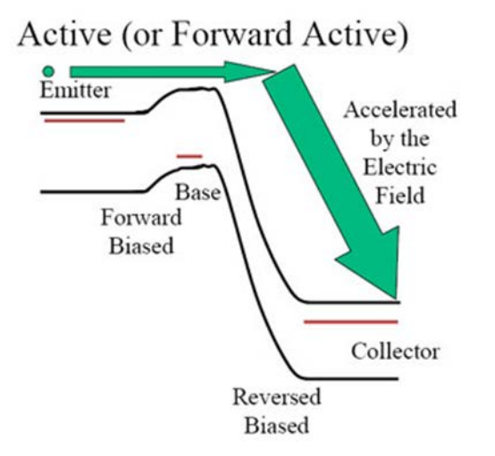 이미터에서 베이스로의 캐리어 이동은 수월하게 되고, 베이스에서 컬렉터로 넘어갈 때 전기장에 의해 가속을 하여 전류의 흐름이 증폭이 됩니다. 따라서. 활성모드는 증폭기의 역할을 하게 됩니다.