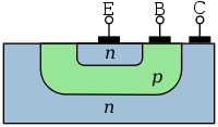 따라서 이미터 전류 = 베이스 전류 + 컬렉터 전류가 됩니다. 또한, 접합시 각 부분은 어느 정도의 도핑을 해주어야 하는데 이미터의 도핑농도가 제일 높고 그다음 베이스, 컬렉터 순으로 농도의 차이가 있습니다. pnp는 이미터로 들어온 전류가 베이스와 컬렉터로 나가는 형태이고 npn은 컬렉터와 베이스로 들어온 전류가 이미터로 나가는 형태입니다.