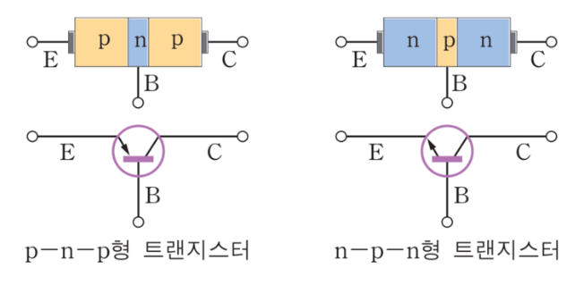 BJT는 양극성의 트랜지스터로 전자와 정공 둘 다 움직이는 소자입니다. BJT는 n-type반도체와 p-type반도체의 접합으로 이루어져 있습니다. n형과 p형을 번갈아 접합을 하여 각 반도체에 전극을 붙여진 형태를 가지고 있습니다. n형 사이에 p형을 넣으면 npn트랜지스터, p형 사이에 n형을 넣으면 pnp트랜지스터가 됩니다.