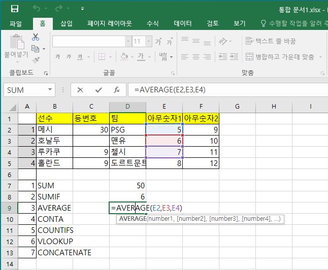 AVERAGE 함수는 말 그대로 각 값의 평균값을 구하는 함수입니다.