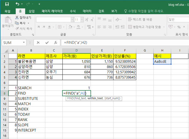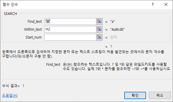 예를 들면 소문자 “a” 를 AaBcdE(H2) 텍스트에서 찾을 경우, 대소문자 구분을 못하며 선택 인수를 써주지 않았기 때문에 첫 번째 A에 해당하는 ‘1’이 산출됩니다.