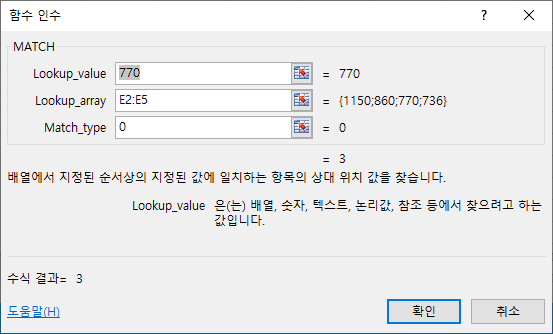 예를 들면 (E2:E5)의 범위 내에서 ‘770’을 찾을 경우 3번째(E4) 값이 770이므로 ‘3’이 산출됩니다.