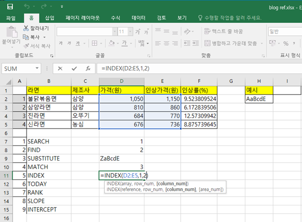 SEARCH, FIND, SUBSTITUTE, MATCH, INDEX 함수