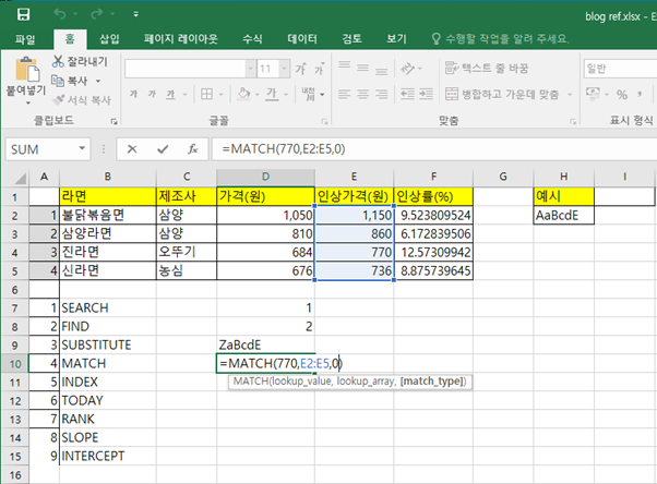 엑셀(Excel)에서 자주 쓰는 함수 정리 3편 (SEARCH, FIND, SUBSTITUTE, MATCH, INDEX)