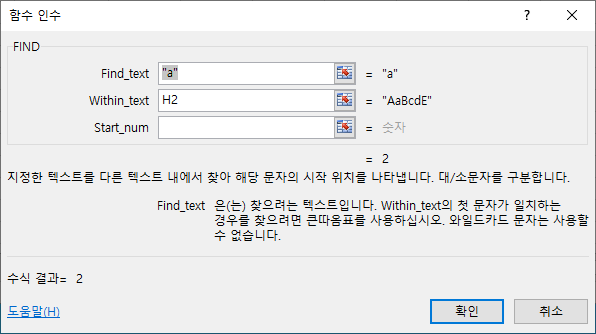 예를 들면 소문자 “a” 를 AaBcdE(H2) 텍스트에서 찾을 경우, 대소문자를 구분해주며 선택 인수를 써주지 않았기 때문에 두 번째 a에 해당하는 ‘2’가 산출됩니다.