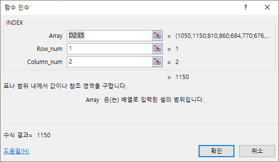 예를 들면 (D2:E5)의 범위 내에서 1행 2열의 값을 찾을 경우 1행 2열에 해당하는 ‘1,150’(E2)가 산출됩니다.